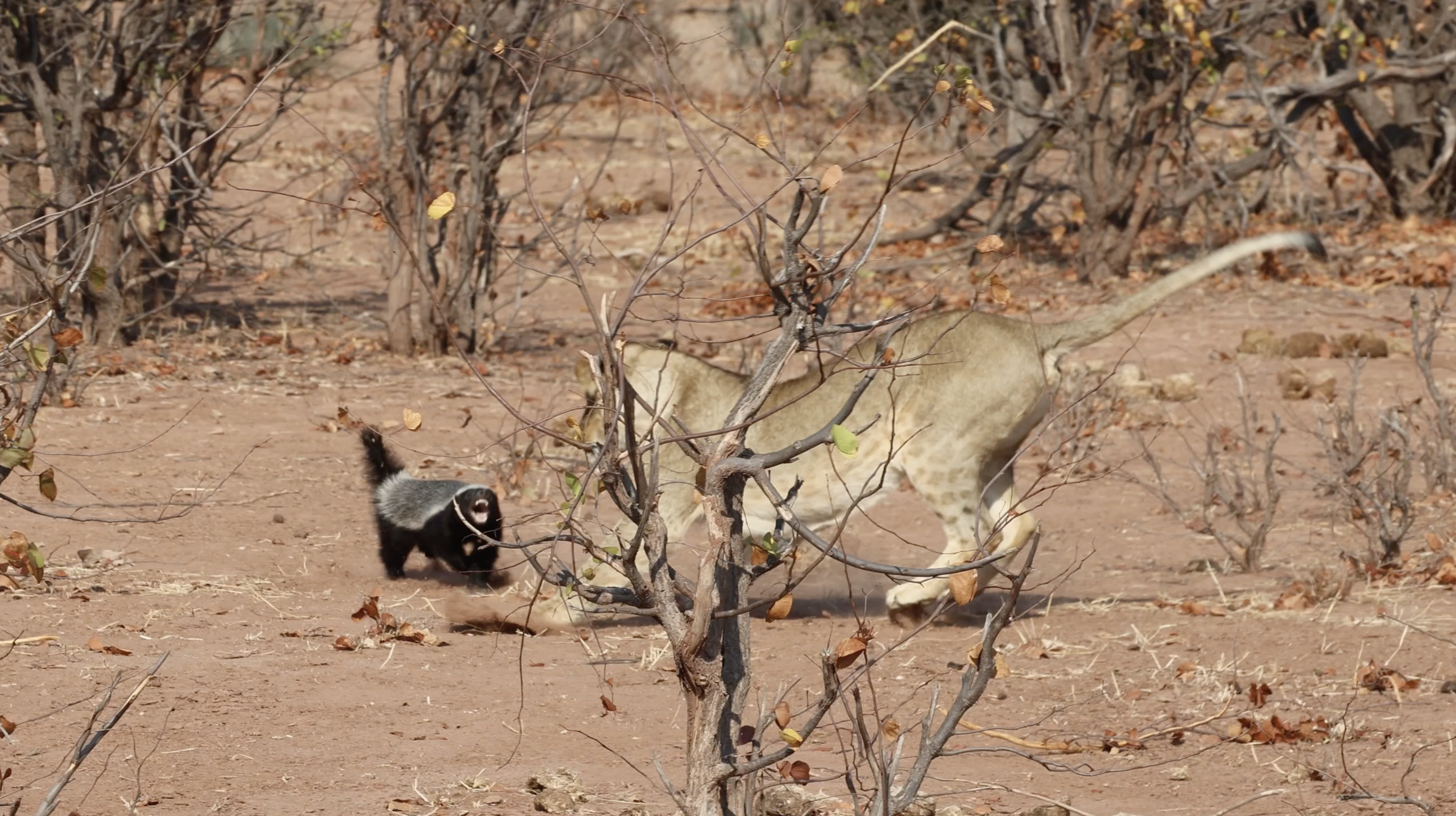 STOP BADGERING ME: BRAVE HONEY BADGER LUNGES AT LION TWICE AFTER BEING CHASED FOR MEAL