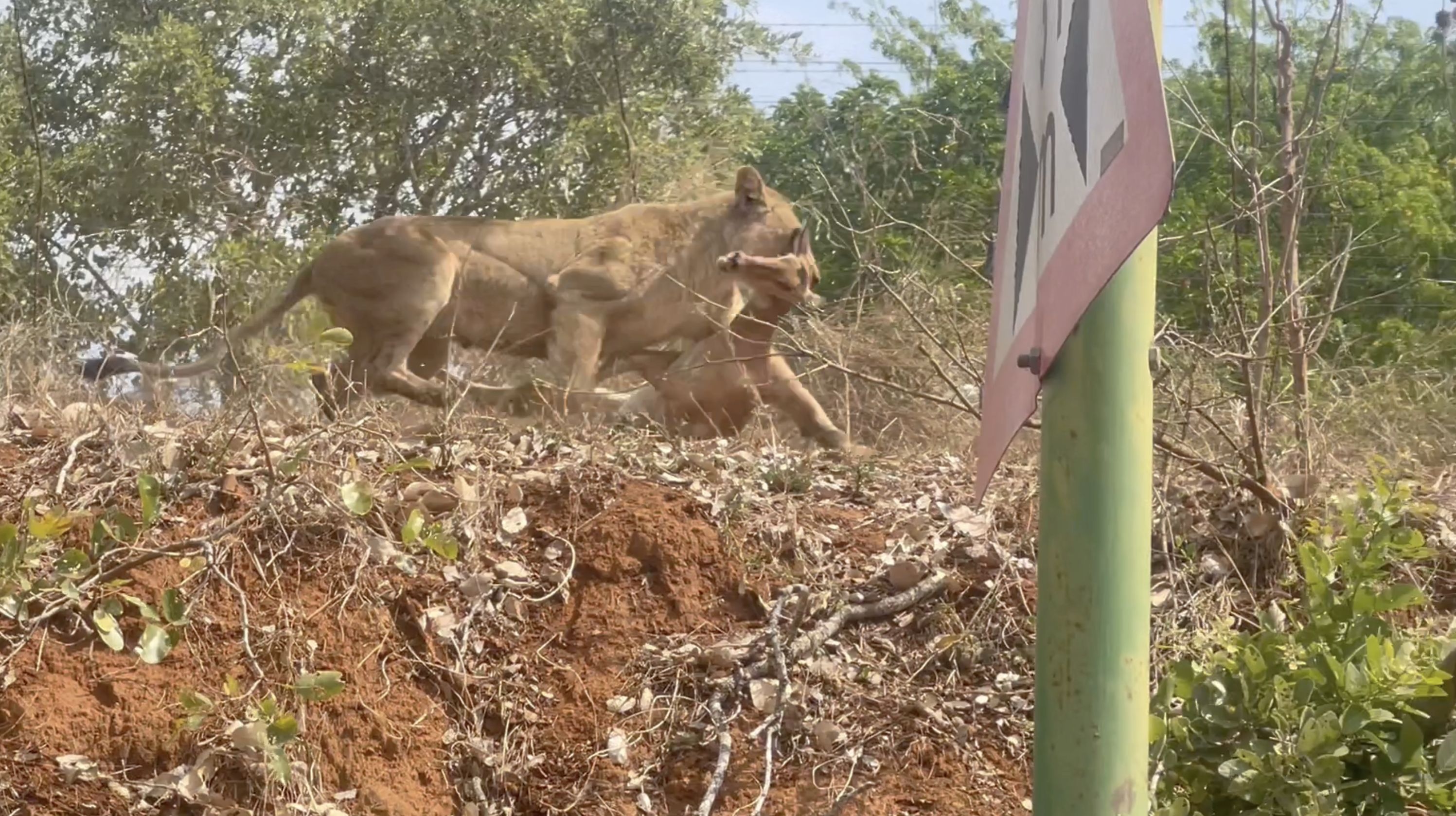 Suddenly the lion ran across the front of Brand’s car and up a nearby bank to catch the unlucky impala before walking off with it in its mouth.