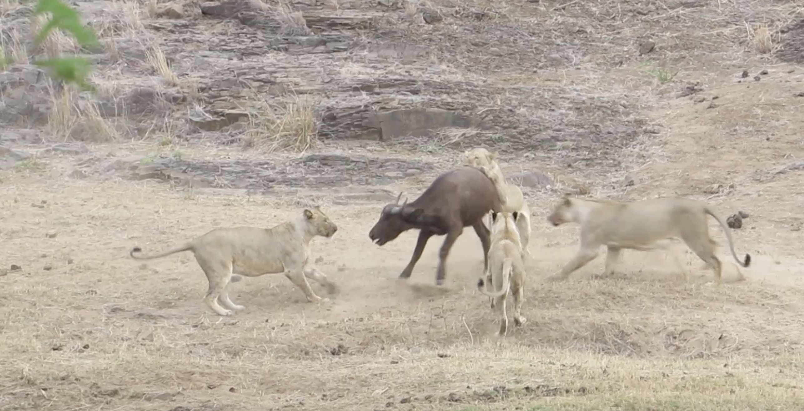 The second prey took a bigger effort with seven lions putting in work to bring it down while a third buffalo was hunted next to some rocks.