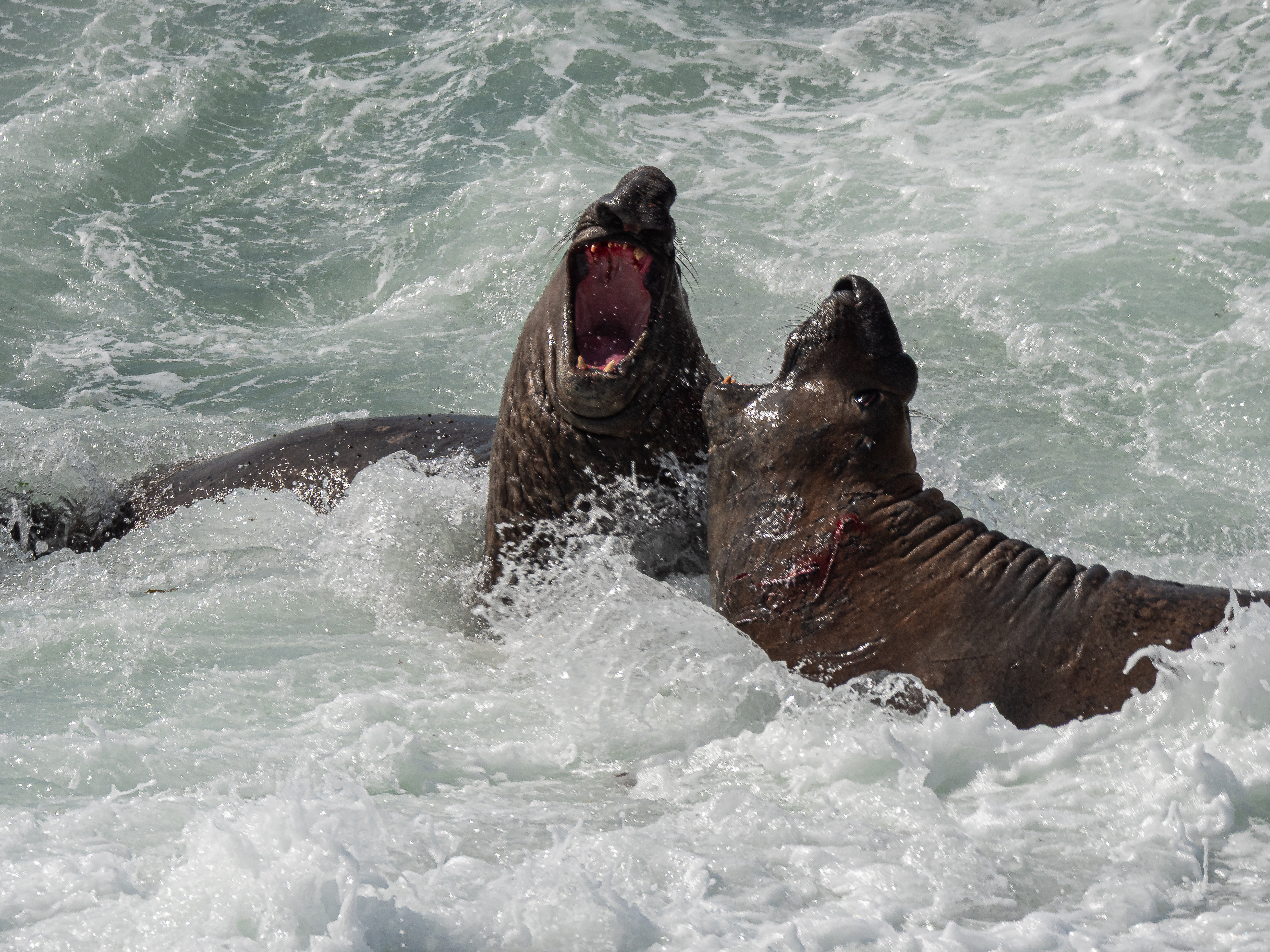A pair of massive elephant seals fought into the ocean for beach dominance.