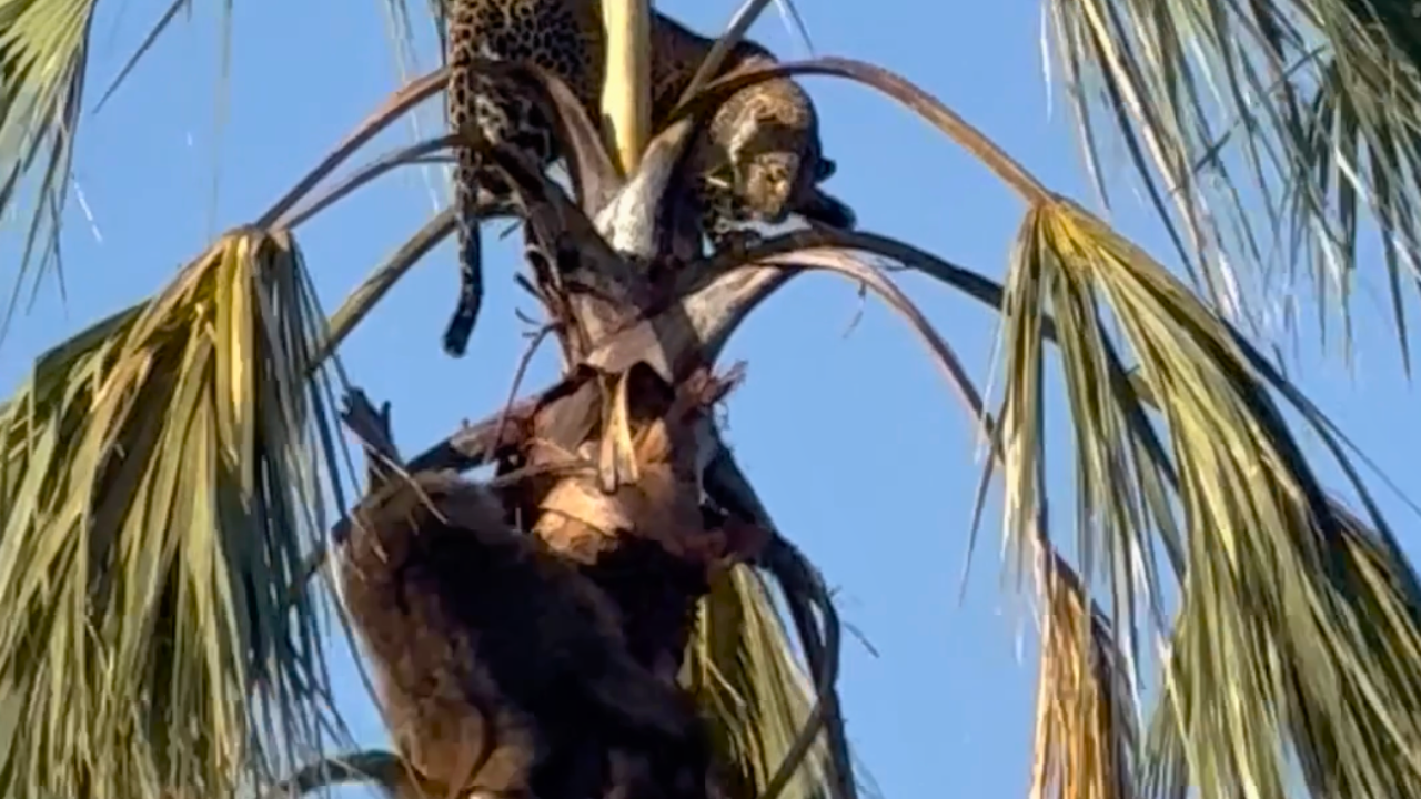 Dramatic footage captured the irate monkeys swiping at a young male leopard stuck at the top of the palm tree.